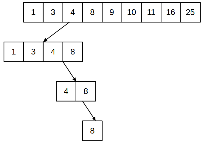 La recherche de 8 dans le tableau [1, 3, 4, 8, 9, 10, 11, 16, 25]. Compléter le schéma suivant avec les comparaisons faites à chaque étape :